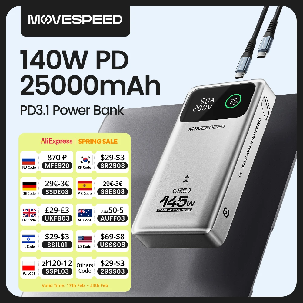 Выбираете надежный и мощный внешний аккумулятор? MOVESPEED M25 100W — это универсальное портативное зарядное устройство, способное заряжать даже ноутбуки. 🔋 С его помощью можно быстро восполнить заряд MacBook, iPhone, планшета или других гаджетов. Актуальные скидки и промокоды помогут сэкономить! 🔗 Ссылка на товар: https://aliprofi.ru/links/MOVESPEED Цена и скидки Как видите, есть промокод на скидку, что супер! 💰 Текущая цена: https://aliprofi.ru/links/MOVESPEED 🎟 Промокод: MFE920 — скидка 919,59 ₽ при заказе от 919,73 ₽ 📉 Купон продавца: -873 ₽ при заказе от 875 ₽ Преимущества MOVESPEED M25 ✔ Мощность 145 Вт – способна заряжать ноутбуки, смартфоны, планшеты. ✔ Ёмкость 25 000 мАч – достаточно для нескольких полных зарядок устройств. ✔ Поддержка быстрой зарядки – USB-C (100 Вт макс.), USB-A (18 Вт макс.). ✔ Цифровой дисплей – показывает вольтаж, ампераж, проценты заряда и время работы. ✔ Компактный размер – удобно носить с собой (15.1 × 8.2 × 2.6 см, 460 г). ✔ Прочный корпус и каче