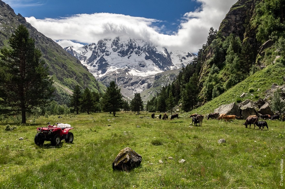 Вчера мы получили разрешение на проход в пограничную зону ущелья Адыр-Су и отлично погуляли, а сегодня продолжим исследовать местные красоты. Наши пропуска действуют три дня. На очереди у нас водопад, так что вперед! Я уже завязываю шнурки на ботинках. - Иван! Чистить и готовить ботинки это пункт третий. А сейчас пункт второй! Мы так будем весь день собираться!,- делает мне замечание мой гид-аксакал. Выдвинулись. Сначала небо заволокло плотными тучами, будто это дым: Красиво уходит вдаль приходящая с очередной вершины речушка: Я абсолютно очарован этими местами. Посмотрите же! Ну глаз радуется!: В низовьях ущелья много ягодников (малина, смородина, барбарис, крыжовник), обитают медведи, косули, западнокавказские туры, серны, лесные кошки и куницы. Мы, конечно, никого не встретили, на пограничники рассказывали, что на днях видели барса. А еще.... - А еще здесь на склонах цветут рододендроны,- Юрий Иванович мне обещал показать. - А вот и рододендроны, Иван! Вот они: - Только вот не успел