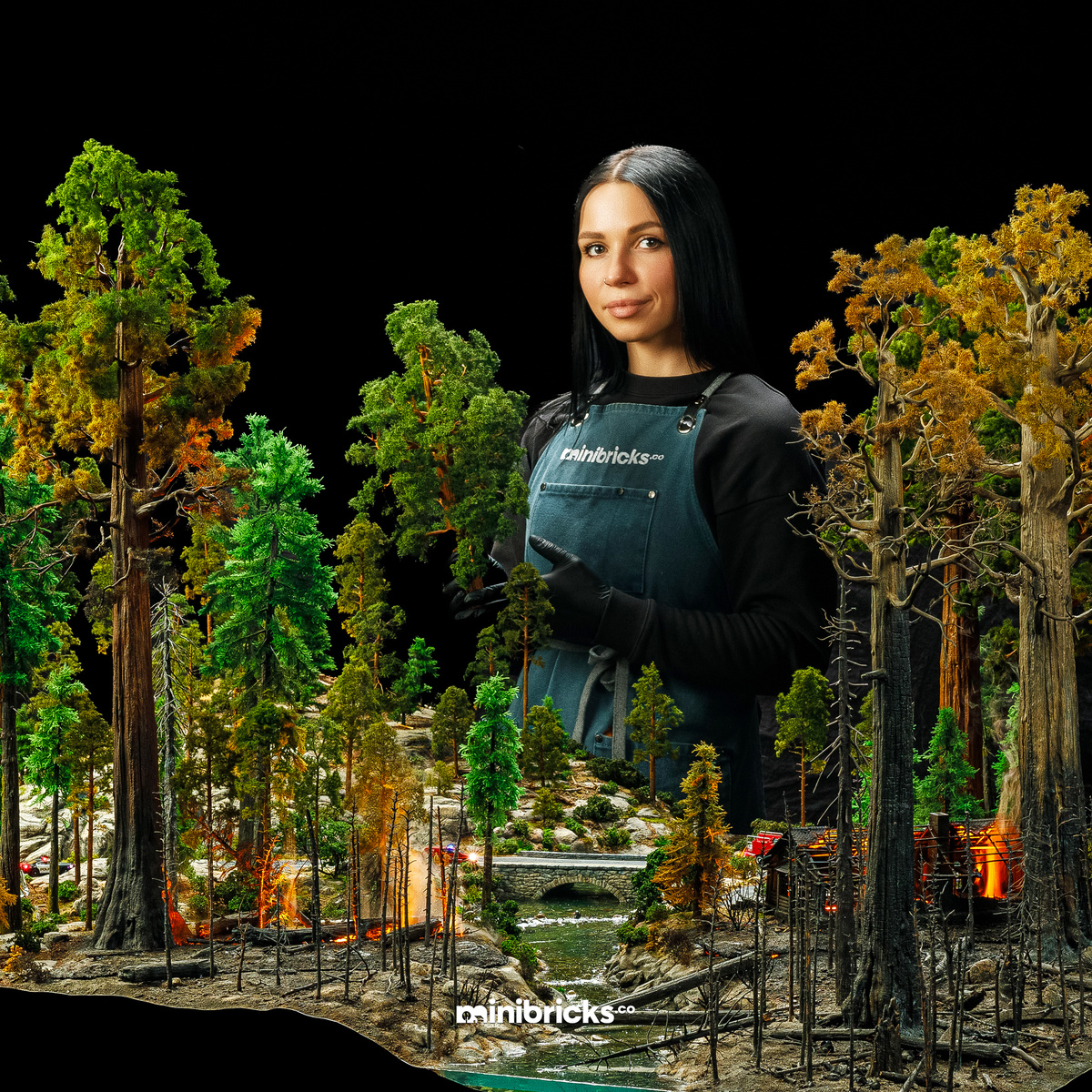 Наша студия Minibricks специализируется на изготовлении реалистичных моделей и в настоящее время работает над большим музейным проектом, включающим модели национальных парков, заповедников и живописных ландшафтов. Мы хотели бы поделиться некоторыми из наших работ и взглядами на изготовление этих моделей. Данный ландшафтный макет был сделан в рамках музейного проекта Национальных парков США. Его физические размеры составляют 1.74x1.5 метра. Масштаб 1:87. Макет олицетворяет события ужасных пожаров в Калифорнии, от которых страдает не только население, но и уничтожаются гектары реликтового леса секвой, некоторым из которых более 1500 лет. Благодаря толстой коре деревья этого вида являются очень огнестойкими, но, например, пожар в 2020 был настолько сильным, что пламя уничтожило листву на высоте более 91 метра. При изготовлении макета мы воссоздали сцену с пожаром. Весь ландшафт и модели секвой были сделаны нашими макетчиками с нуля. Каждое дерево обрабатывалось вручную, а кроны деревьев р