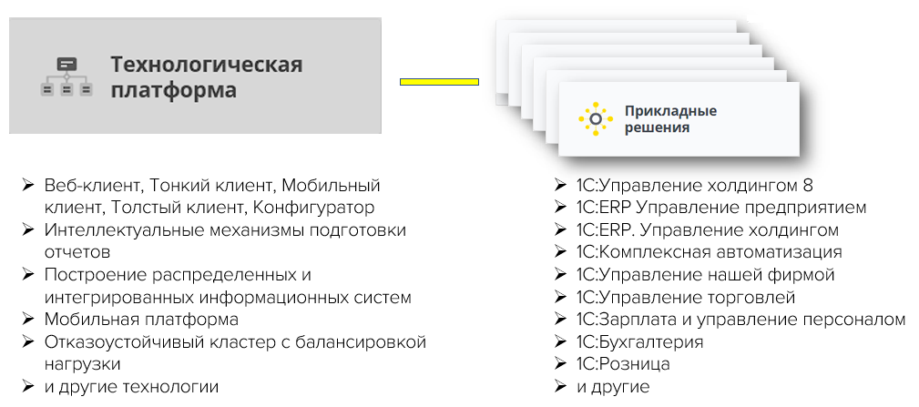 Система программ 1С:Предприятие состоит из технологической платформы (ядра) и разработанных на ее основе прикладных решений (конфигураций). Такая архитектура системы принесла ей высокую популярность, поскольку обеспечивает открытость прикладных решений, их функциональность и гибкость, короткие сроки внедрения, высокую производительность, масштабируемость от одного до десятков тысяч рабочих мест, работу в режиме «облачного» сервиса и на мобильных устройствах.
