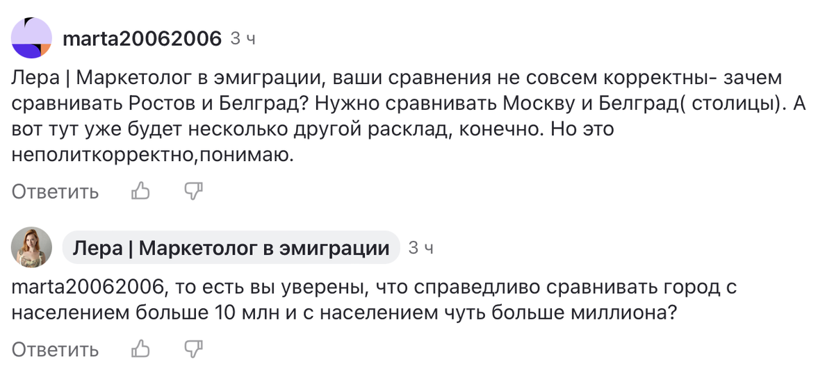 Полгода назад мы с мужем переехали в Сербию, и я стала вести блог о жизни в другой стране. Постепенно начала делиться своими наблюдениями, сравнивать быт, инфраструктуру и атмосферу. Недавно в комментариях мне написали, что сравнивать Белград и Ростов-на-Дону, где я прожила пять лет, необъективно. Но я как раз считаю, что это вполне уместное сравнение. Привет! Меня зовут Лера, и я эксперт по продвижению и продажам в социальных сетях. На этом канале пишу про маркетинг, продвижение и свою жизнь. Подписывайся, у меня интересно! Таких мегаполисов, как Москва, в мире единицы. Это города-гиганты с многомиллионным населением, колоссальными бюджетами и глобальным влиянием. Например, Нью-Йорк, Лондон, Токио, Дубай, Пекин – их можно пересчитать по пальцам одной руки. Они существуют в совершенно особых условиях и не могут быть эталоном для сравнения с большинством столиц. Аргумент, что столицы должны сравниваться между собой, кажется мне несправедливым. У каждой страны свои ресурсы, своя история