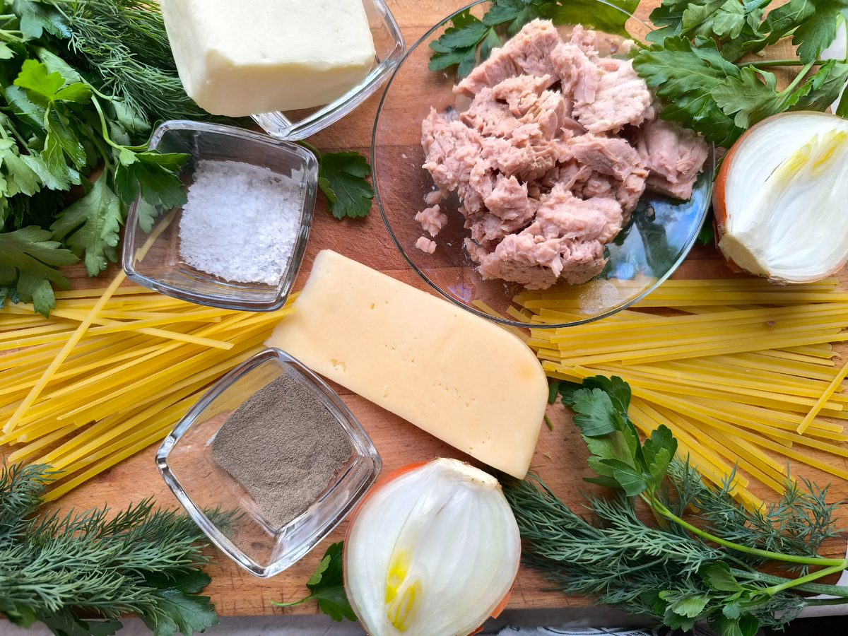 Сколько ни перепробовала разных вкусных блюд со сложным составом, со сложными соусами, в который раз убеждаюсь, что простая еда -- самая вкусная. Всего четыре ингредиента (если не класть сыр) и у вас на ужин очень вкусное блюдо! Даже третьеклассница справится ( если научилась макароны варить). Для приготовления спагетти с тунцом нам потребуется: спагетти из твёрдых сортов пшеницы (они вкуснее), банка консервированного тунца филе куском в собственном соку, средняя луковица, сливочное масло. В принципе этих продуктов уже достаточно для приготовления ВКУСНОГО блюда. Дополнительно можно добавить тёртый сыр, зелень, лимонный сок, оливки и далее по вкусу, что нравится, каперсы например. По традиции добавляю список необходимых посуды и кухонного инвентаря: сковорода с толстым дном, разделочная доска, поварской нож, нож для очистки луковицы, мешочек для отходов и мусора, дуршлаг, тёрка для сыра, деревянная ложка для помешивания, щипцы для макарон. Готовку начнём с того, что включим чайник и в