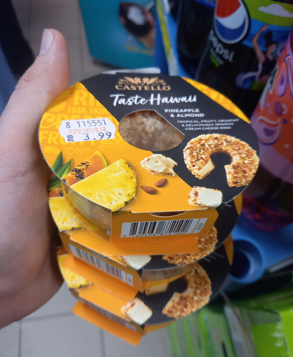 И так начнем с сыров. Мой самый любимый среди них – сладкий кремовый сыр с миндалем и ананасами, произведенный, как ни странно, в Дании. Хотя в продаже я его встречал во многих странах, от Испании и Франции до Эстонии и Болгарии. Стоил он каждый раз порядка 200 рублей в переводе на наши деньги. Но вкусно просто неописуемо. У нас я его, кстати, тоже не так давно впервые увидел в продаже, правда, стоимостью 850(!) рублей, то есть в четыре с лишним раза дороже. Естественно, поскупился. Но посмотрим, может, на день рождения расщедрюсь и порадую себя:)