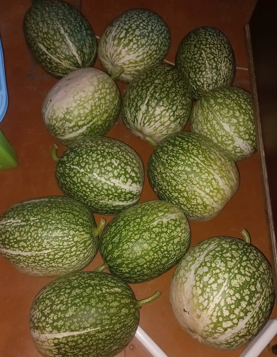 Она же тыква фиголистная, как понятно, из-за формы листа. Выросло у меня в прошлом сезоне такое богатство: И это я ещё пыталась нормировать количество плодов и срезала маленькие завязи, где найду. Проблема была найти: плети разрослись густо, листьями всё прикрыли, урожай увидела только по осени после заморозков. Эти все вызревшие, с прочной корой, всю зиму пролежали просто в комнате на полу, в тепле. И вот вскрываем одну. Мякоть белая, сочная, а как пахнет арбузом! Но так как тыквы у меня на семена, то серединка вся уже волокнистая и горькая, а вот небольшой слой мякоти у коры сладкий. Семена после извлечения выглядят так: Они все в слизи, отмыть которую так и не получилось. На просушку разложила из на газету и вот что вышло: Тут семена уже оторваны от газеты (на некоторых следы остались). Для прививок более чем достаточно, и на этот год, и на следующий и ещё пара горстей останется. И это только один плод, а их еще 11! Можно продавать😁