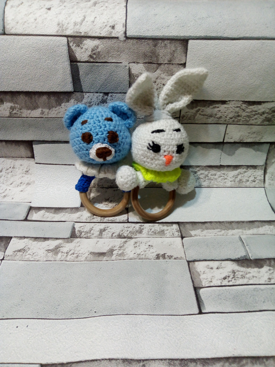 Пряжа детская новинка Синтепон Крючок ✓2 Деревянное колечко Гремелка для погремушки Вставьте глаза между 13 и14 рядами. 17. 6 сбн, убав*6 =42 сбн 18. 5 сбн , убав *6= 36 сбн 19. 4 сбн , убав*6= 30 сбн Наполните голову, вставьте гремелку. 20. 3 сбн 21. 2 сбн 22. 1 сбн 23 . 6 убав Стяните отверстие . Оставьте нить для пришивания . 8 . 24 сбн, этим рядом соедините края вокруг кольца. Оставьте нить для пришивания . Сложите ушко пополам и провяжите за обе стороны 6 сбн. Оставьте нить для пришивания . Оставьте нить для пришивания . 14. 4 сбн, убав *3=15 сбн 15. 3 сбн , убав *3=12 сбн Провяжите за обе стороны 6 сбн, сложите пополам и пришейте к голове . Приятного вязания !!!