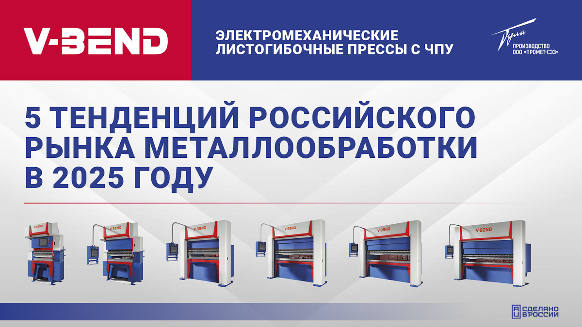 Меняется Россия — меняется и металлообработка. Почему? Металлообработка — основа промышленного производства. Новые технологии, экологические вызовы и мировая экономика формируют ключевые тренды. В 2025 году отрасль развивается быстрее, чем когда-либо. Сегодня вместе со специалистами ПРОМЕТ расскажем о пяти тенденциях, которые определяют будущее российского рынка металлообработки. 1. Уход от европейского оборудования Импорт станков из Европы сократился, но отечественные производители взяли ситуацию под контроль. Яркий пример — электромеханические листогибочные прессы V-Bend. Это первые станки такого типа, произведённые в России. Почему российские производители выбирают V-Bend: - В отличие от гидравлических станков, в электромеханических не нужно менять масла, жидкости и фильтры. Это упрощает процесс, а рабочее место становится чище. - Расход энергии на 80% ниже по сравнению с той же гидравликой. - Удобство и многообразие комплектации. Все прессы подходят для гибки металла толщиной от 0,