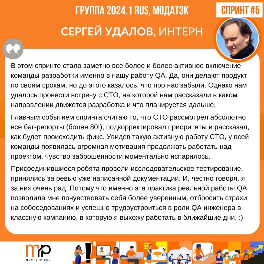 Спринт 5: Анализ баг-репортов и коррекция приоритетов Пятый спринт начался с совместного анализа баг-репортов, собранных за первый месяц работы. В этом ключевом мероприятии принял участие технический директор компании (СТО) Павел, который лично скорректировал приоритеты задач и разъяснил команде план действий по устранению выявленных дефектов. Лид-интерн Егор М. проявил себя как эффективный руководитель, оказывая активную помощь своим коллегам в решении возникающих вопросов. Пятый спринт продемонстрировал важность обратной связи от руководства и эффективного управления процессом исправления ошибок. Сергей Удалов, интерн: “Именно эта практика реальной работы QA позволила мне почувствовать себя более уверенным, отбросить страхи на собеседованиях и успешно трудоустроиться в роли QA инженера в классную компанию, в которую я выхожу работать в ближайшие дни.” Егор Медведев, лид-интерн: “Прошел первый спринт, как меня назначали лидом-интерном команды. И в целом я доволен своим первым опытом.