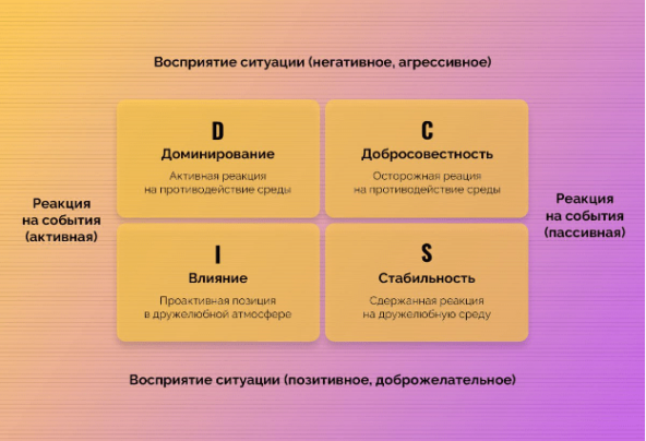Можно ли собрать идеальную команду, где каждый работает на своем максимуме? Это не всегда просто. Иногда менеджер по продажам увлекается аналитикой вместо общения с клиентами, а бухгалтер предпочитает рисковать. Справиться с такими вызовами помогает методика DISC, которая выявляет поведенческие особенности сотрудников и помогает оптимально распределить обязанности. А подробнее про методы анализа сотрудников говорим на Human. Обучение персонала. 40+ спикеров, HR-практиков, из компаний Додо Пицца, МТС, VIG Trans, Россети, НЛМК, X5 Group, АЭРО, Мегафон, Магнит Маркет, FUN&SUN и другие. Смотрите полный список на сайте. DISC — это аббревиатура, обозначающая четыре стиля поведения: Доминирование (Dominance) — активные действия в конкурентной среде. Влияние (Influence) — активные действия в дружественной среде. Стабильность (Steadiness) — пассивные действия в дружественной среде. Добросовестность (Conscientiousness) — пассивные действия в напряженной среде. Методика помогает избежать ошибок п