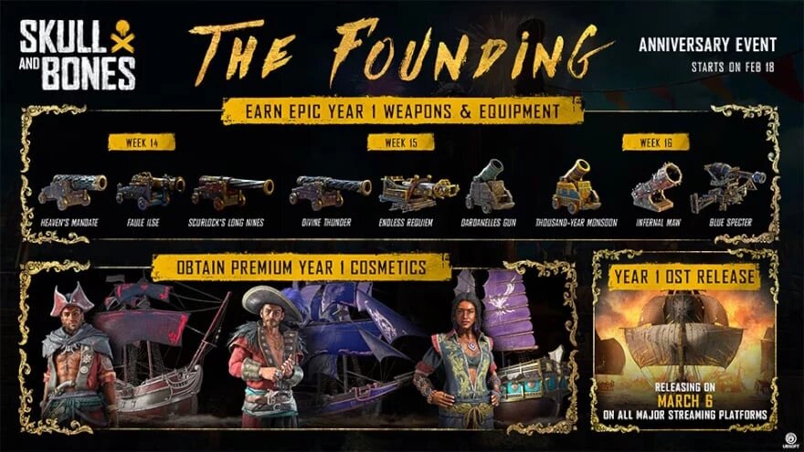 В феврале 2025 года Ubisoft отмечает первую годовщину своего морского экшена Skull and Bones, запуская специальное событие под названием «The Founding». Мероприятие начнётся 18 февраля и продлится несколько недель, предоставляя игрокам уникальные возможности и награды.