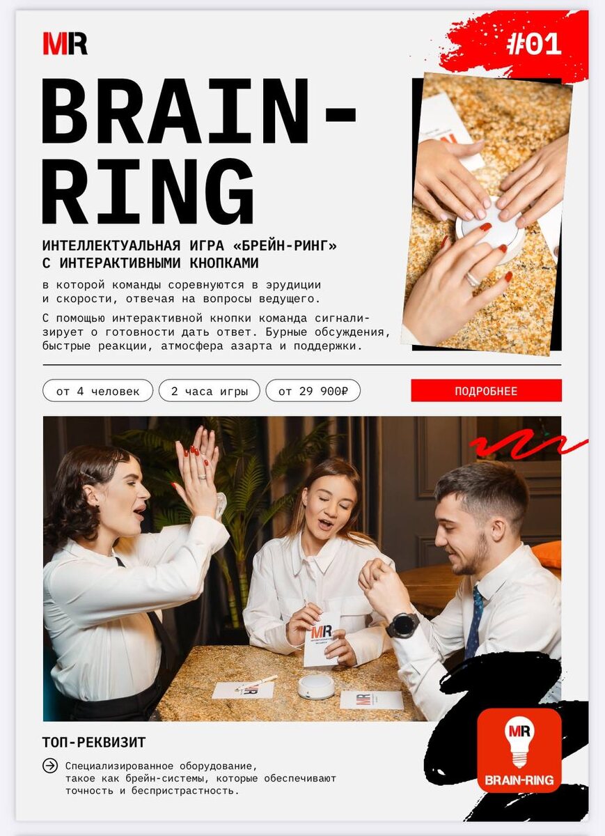 🧠Мозговой штурм Бурные обсуждения, быстрые реакции, атмосфера азарта и поддержки 👀Адаптация Индивидуальный подход с адаптацией вопросов под уровень образования и интересы участников 🔝Топ-реквизит Специализированное оборудование, такое как брейн-системы, которые обеспечивают точность и беспристрастность ✅ЗАКАЗАТЬ ИГРУ → https://mr-games.ru/bran-ring/