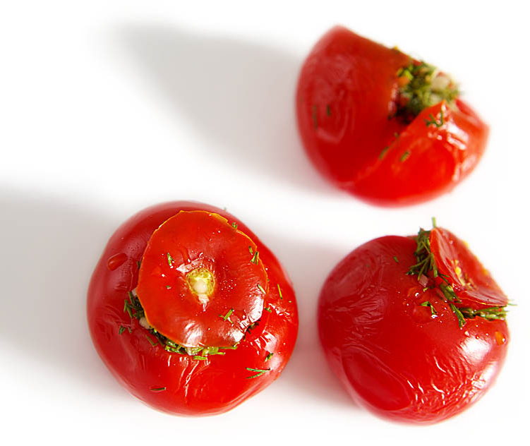 В каждый помидор положим по ложечке измельченного укропа и чеснока и прикроем крышечкой. В принципе, мы уже всё сделали. Можно уложить эти помидоры в посуду, подержать их некоторое время в тепле, а потом поставить в холодильник для хранения и, само собой разумеется, употребления.