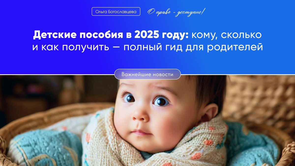 Детские пособия в 2025 году назначает и выплачивает СФР. Их размер и порядок выплаты зависят от возраста ребенка и дохода семьи. Выплаты могут быть единовременными или ежемесячными, а также предоставляться автоматически или по заявлению. Пособия могут получать: Единовременные: Ежемесячные: Регионы могут предусматривать дополнительные выплаты, такие как пособия для малообеспеченных семей и ежемесячные выплаты при рождении третьего ребенка. Для получения пособий необходимо соответствовать требованиям к доходам и подать заявление в соответствующие органы. Не упустите возможность получить положенные вам выплаты! Ознакомьтесь с полным обзором, чтобы узнать больше о детских пособиях в 2025 году. Ежедневно на данном канале выходит качественный материал на самые разные темы из мира юриспруденции! Говорим о важном понятным языком! TenChat — уникальный контент из правового сектора на постоянной основе в удобном формате! WhatsApp — записаться на консультацию или получить ту или иную правовую подд