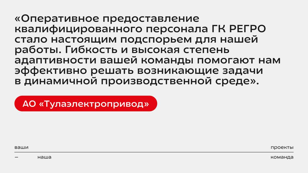 Мы работаем в сфере аутстаффинга уже более 10 лет. За это время сотни компаний получили с нашей поддержкой надежных и квалифицированных работников. Рады помогать бизнесу решать ключевые задачи! Вот что говорят о нашей работе представители АО «Тулаэлектропривод»: 💬 «АО «Тулаэлектропривод» выражает свою искреннюю готовность рекомендовать ГК РЕГРО в качестве надежного партнера по предоставлению аутстаффинговых услуг. Оперативное предоставление квалифицированного персонала ГК РЕГРО стало настоящим подспорьем для нашей работы. Гибкость и высокая степень адаптивности вашей команды помогают нам эффективно решать возникающие задачи в динамичной производственной среде. Мы высоко ценим ваш профессионализм, оперативность и внимательное отношение к нашим потребностям. Благодаря вашей поддержке нам удалось значительно повысить эффективность выполнения проектов и обеспечить высокие стандарты качества». 🔺 Огромное спасибо за вашу оценку! #ОбратнаяСвязь #РЕГРО #аутстаффинг