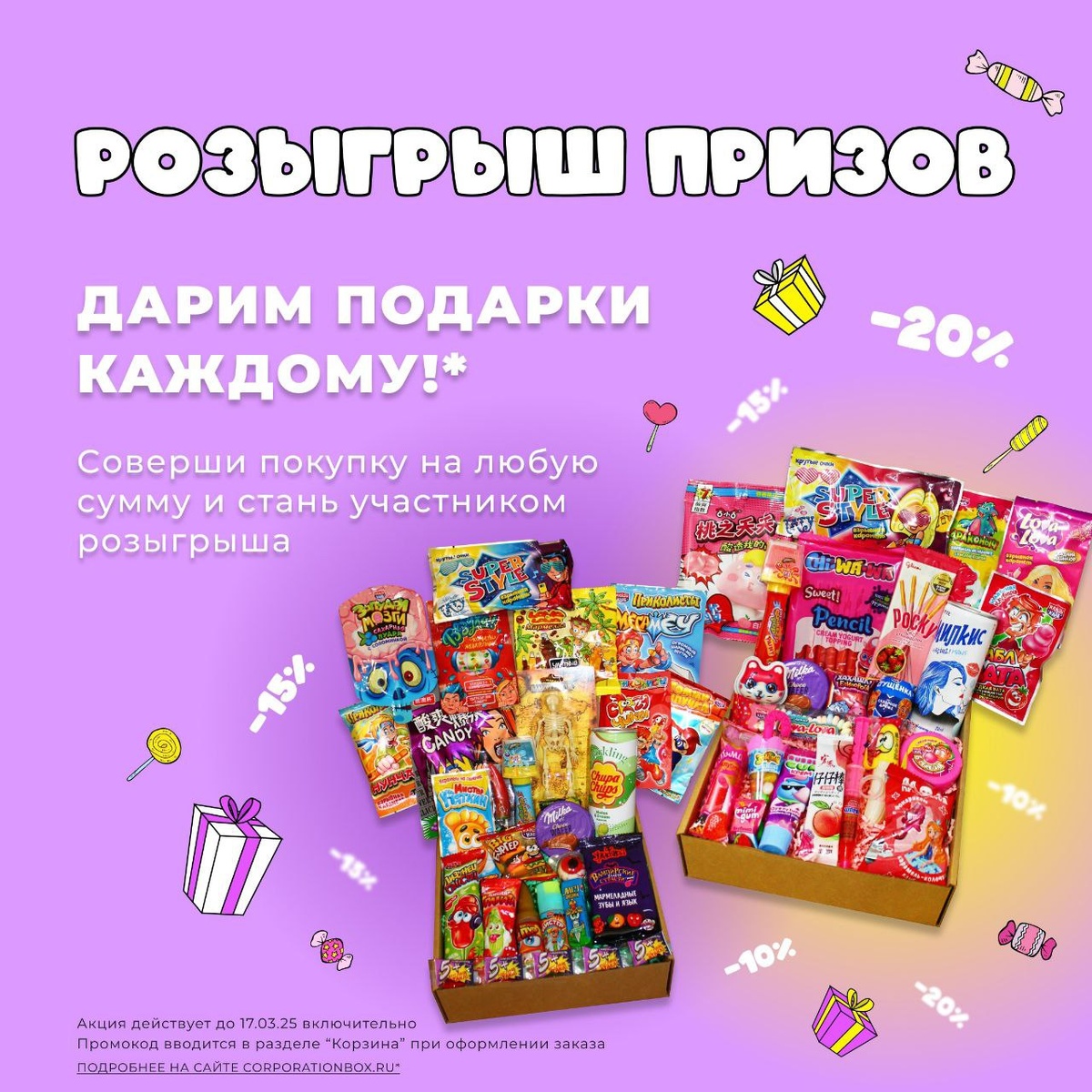 🎉 Внимание, грандиозный РОЗЫГРЫШ на нашем сайте! 🎉 В честь замечательных праздников 23 февраля и 8 марта мы запускаем уникальный розыгрыш с невероятными призами! 🎰 7 призов и 7 победителей! - Стильный бокс для мальчика; - Чудесный бокс для девочки; - 100% выгода на бокс; - 100% выгода на доставку; - Промокод на скидку 20%; - Промокод на скидку 15%; - Промокод на скидку 10%. Чтобы стать участником розыгрыша, просто совершите покупку на любую сумму на сайте 🛒 Итоги мы подведем 17 марта в 16:00 по МСК в прямом эфире на площадках VK и Телеграмм. 📅 После оформления и оплаты заказа вы получите номер, по которому Генератор случайных чисел выберет победителей и призеров! 🌟 У вас есть все шансы стать победителем! Приглашайте друзей участвовать в розыгрыше и следите за обновлениями. Не упустите свой шанс! 📢 Удачи всем участникам! 🍀