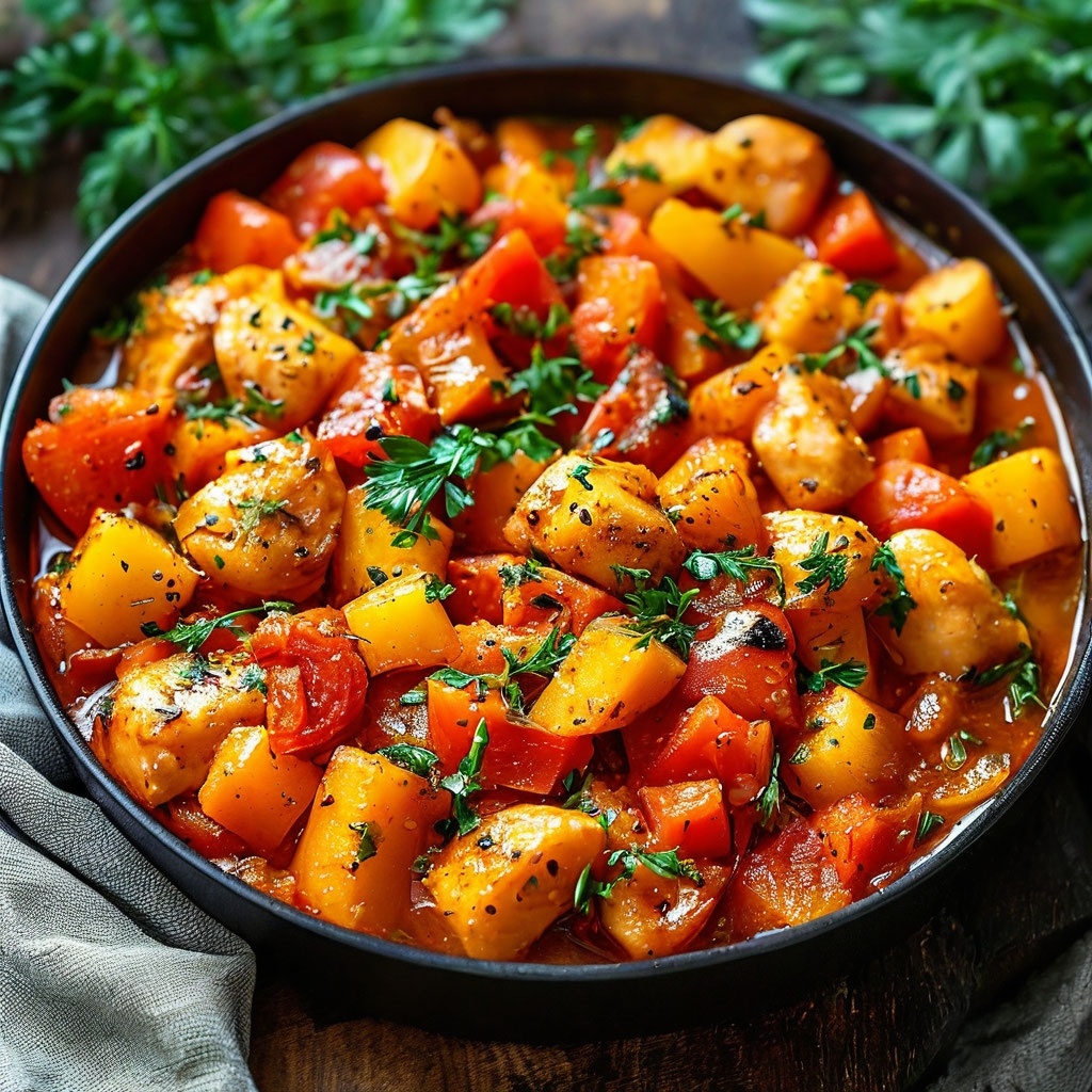 Куриное рагу с овощами — это вкусное и полезное блюдо, которое идеально подходит как для обеда, так и для ужина. Оно сочетает в себе нежность курицы и разнообразие овощей, что делает его питательным и сытным. - Курица (любые части) — 600 грамм - Брокколи — 250 грамм - Картофель — 3-4 штуки - Помидоры — 2-3 штуки - Лук — 1 штука - Морковь — 1 штука - Капуста — 200 грамм - Болгарский перец — 100 грамм - Чеснок — 2-3 зубчика - Растительное масло — 50 мл - Соль — по вкусу - Специи — по вкусу - Калорийность: 112 ккал - Белки: 5 г - Жиры: 8 г - Углеводы: 6 г 1. Подготовка ингредиентов: - Нарежьте курицу на порционные кусочки. - Нарежьте лук и морковь произвольно. - Разделите брокколи на соцветия. - Нашинкуйте капусту и нарежьте болгарский перец соломкой. - Нарежьте картофель небольшими кубиками. - Измельчите чеснок. 2. Обжарка курицы: - Обжарьте курицу на сильном огне до появления румяной корочки, добавив соль и специи. 3. Добавление овощей: - Добавьте к курице нареза