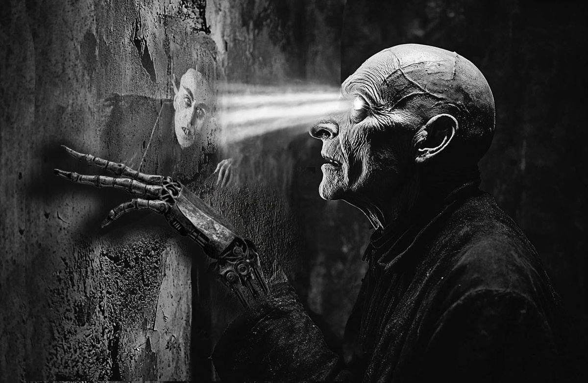 Доброго времени суток! Продолжаем визуализировать мистически-готитическую историю "Носферату: невеста смерти" Корвинуса Олеандера. Первая визуализация и вторая вышедшие ранее. Очень интересный фрагмент книги в плане иллюстрирования. Технически не очень простой как в построении промта, так и количества "неудачных дублей". Кстати, эти изображения, сделаны в коллаборации, так как некоторая доработка "до кондиции" произведена самим автором. - За несколько дней до нашего с Вами знакомства, – сказал Криптус позже, когда они с Гекатой с бокалами в руках сидели в гостиной у пылающего камина, – я имел удовольствие познакомиться с магией простецов, которая, как Вам известно, основана на изучении законов природы и умении этими законами пользоваться. Называется – синематограф. Представьте себе большую залу, заполненную рядами стульев. На одной стене растянуто огромное бело полотно. В залу набивается человек двести, не меньше. Люди платят несколько мелких монет и занимают места. Свет гаснет. На м