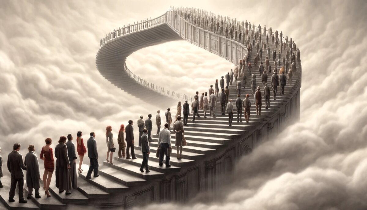 Ступеньки, по которым мы подымались, уходили прямо в серое, заполненное облаками, небо! Причём лестница неестественно извивалась змеёй и не имела никаких подпорок. По законам физики, такая конструкция просто не может существовать. Но несмотря на это, передо мной – тысячи людей, позади ещё больше, и никого не волновало происходящее. По бокам – невысокие перила по пояс, как по мне выполняющие чисто декоративную функцию. При всём желании, я бы не решился их перескочить, за ними – пустота. Внизу клубился с такой же как и облака серый туман. На миг даже показалось, что в одном месте пелена истончилась настолько, чтобы сквозь небольшую проплешину я различил вулканы и раскалённую лаву.