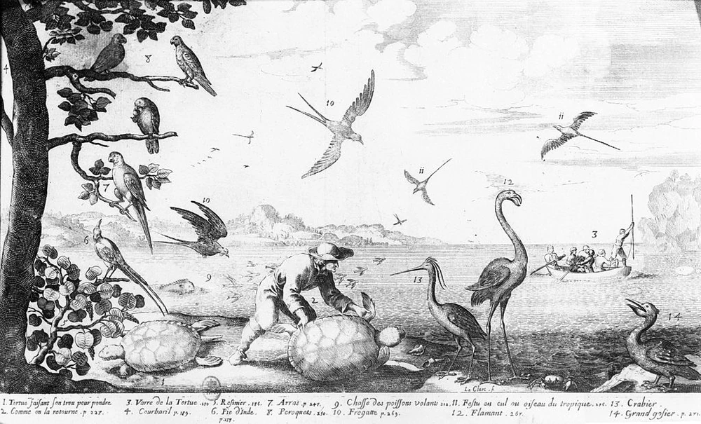 Гваделупа - это группа небольших островов в Вест-Индии, которые были колонизированы европейцами в XVII веке. Тропические острова привлекли массу переселенцев, которые нанесли непоправимый вред местной флоре и фауне. На этой иллюстрации Жана-Батиста Дю Тертра можно заметить двух крайне любопытных птиц на дереве. Первый, сидящий в середине и держащий в лапке какой-то плод, является гваделупским амазоном (Amazon violacea (Gmelin, 1788)). Это - единственное прижизненное изображение птицы, однако говорить о его достоверности стоит с опаской. Амазоны на гваделупе - это странный предмет. Они вроде бы есть, а вроде бы - нет. По крайне мере, учёные сходятся во мнении, что представители этого рода обитали на этом острове, основываясь на описаниях колонистов и археологических находках. Только вот долгое время было непонятно, шла ли речь о каком-то особенном местном виде, или же о популяции уже известного вида. Первое описание птицы, составленное Иоганном Гмелином в 1788 году, определяло его к жак