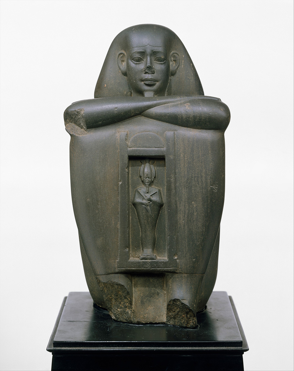 Эта необычайно прекрасная и хорошо сохранившаяся статуя является саисcкой по происхождению, дате и стилю. Она была сделана для храма в Саисе, важном городе западной дельты Нила. Статуя изображает правителя округа, жившего во времена 26-й, или саисской, династии (ок. 685-525 гг. до н. э.). Саисские цари стояли во главе одного из последних периодов расцвета египетского искусства, возрождения, столь поразительного, что его иногда называют "саисским ренессансом". Данный стиль характеризуется элегантностью, привлекательностью и разумным заимствованием из более раннего египетского искусства. В статуях, подобных этой, сдержанность и утонченность сочетаются в новом балансе, который стал образцом идеального человеческого облика для остальной части эпохи фараонов. Перед нами мужчина, сидящий на земле, подтянув колени к груди и сложив руки на коленях. Это довольно стандартный египетский тип статуи. Сидящая на корточках фигура может быть закутана в плащ или, как в данном случае, одета только