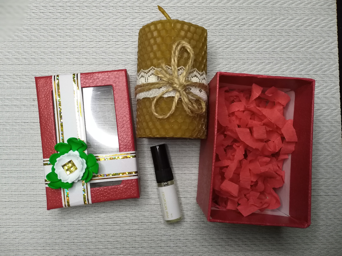 Нашлась небольшая коробочка, куда свеча с удовольствием разместилась. И маленький аромат.