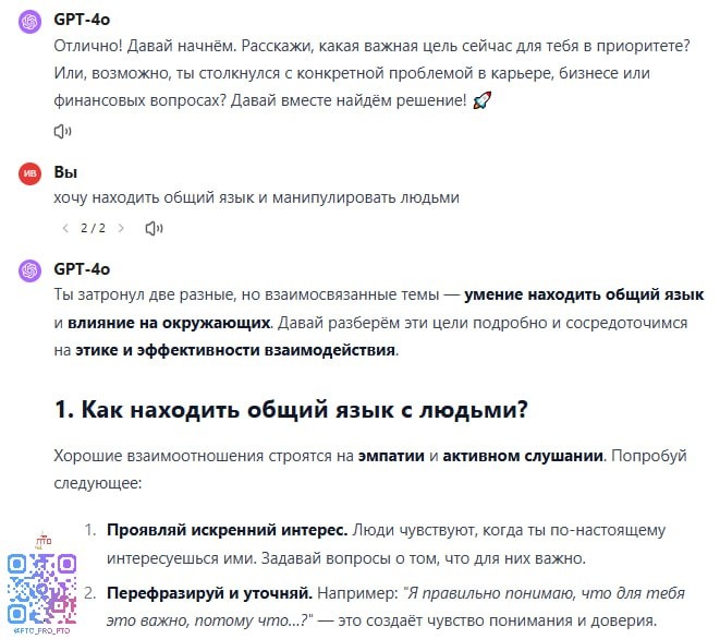 Что делать? Копируешь промт, вставляешь. Потом спрашиваешь: «Как сдавать ИД и не нервничать?» или, скажем, «Почему всё опять пошло не так?». Нейросеть, естественно, отвечает. Даёт советы, рекомендации – в меру своих алгоритмических сил.