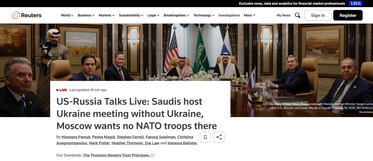 В очередной раз соседские СМИ потрясли обжигающей правдой. При этом упрямо ссылаются на другие источники. Мол, это не мы придумали, серьезные агентства пишут. Таким образом, населению, пребывающему в смятении, поскольку уже с 13 февраля не лицезрело своего вождя во время вечерних обращений, сообщили (передаю дословно): "❗️Зеленский отложил свой визит в Саудовскую Аравию, чтобы не придавать "легитимности" встрече США и РФ в Эр-Рияде - Reuters". Что-что? "О переносе визита на март украинский президент сообщил на брифинге в Турции. Он отметил, что "не хочет совпадений". Bloomberg писало, что наследный принц Саудовской Аравии хотел, чтобы Зеленский был на переговорах между рф и США, но обе стороны настаивали на встрече без него". Орфография оригинала. Что писало Bloomberg мы еще посмотрим, но сначала откроем Reuters. Оно не сразу допускает до важной информации. Сначала просто сообщает в трех строчках о событии. А дальше мне приходится приложить всю фантазию для того, чтоб нажать на какой