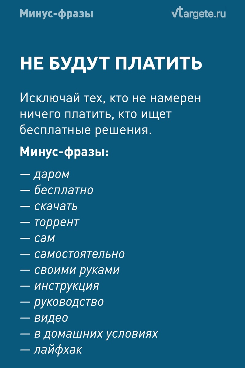 Настройка таргета по ключевым фразам — одна из самых эффективных настроек в VK. И помимо лайфхака с частотой ключевых фраз, есть ещё один важный нюанс, который заметно увеличивает эффективность такой рекламы. 1. Исключай тех, кто не намерен ничего платить. Фразы: даром, бесплатно, скачать, торрент, сам, самостоятельно, своими руками, инструкция, руководство, в домашних условиях, лайфхак. 2. А также тех, кто хочет взять условно бесплатно: бу, барахолка, складчина, из Китая, Али, Авито, аренда, прокат. 3. Кто сам продаёт, отдаёт или предлагает услугу: продаю, отдам, реклама. 4. Кто просто ищет работу в данном направлении: вакансия, отдел кадров, работа, стажировка, вахта. 5. Кто ищет вдохновение и идеи: идеи, вдохновение, примеры, подборка. Обычно сюда же относятся запросы на английском языке — люди ищут зарубежные примеры. Дополнить этот список поможет статистика по ключевым фразам. Открываем таблицу и смотрим, по каким ключам уже были показы и переходы, исключаем нецелевые. Для удобств