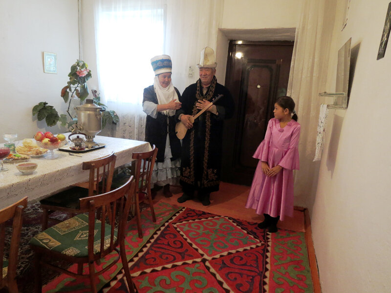 В Кочкорке, киргизском райцентре в горах Тянь-Шаня, мы заночевали спонтанно: художница Фатима показала нам войлочные дела (как мы и планировали), и просто мы ей, видимо, понравились - поэтому уже под вечер она предложила нам покататься по окрестностям на её машине, взяв с нас денег только за бензин. Вернулись мы уже затемно, и она определила нас в гестхаус, за которым присматривают её родители. По сути обычный дом, со старой мебелью и хрусталём в шкафах... но только на полу - свалянные Фатимой ширдаки (войлочные ковры), по которым из-за многослойности так приятно ступать... Ухаживала за нами в основном эта девочка - приносила нам ужин и завтрак (фрукты, баурсаки и вкуснейшее варенье, да настоящий самовар). Имена старших я забыл, но ата здесь - учитель физики и информатики, а апа - учительница киргизского языка в Кочкорской школе. Утром, на прощание, они нарядились в народные костюмы и устроили нам маленькое. порядка получаса, фольклорное представление: Начали, как водится, с "Манаса"