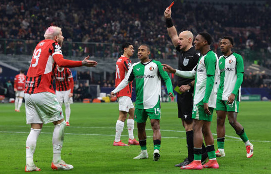 Ответный стыковой матч против "Фейеноорда" "Милан" начал агрессивно и сумел забить быстрый гол – Сантьяго Хименес поразил ворота своей бывшей команды после скидки Тиава. Миланцы и не думали останавливаться на достигнутом. Рейндерс запустил мяч выше перекладины после передачи Уокера. Чуть позже Сантьяго Хименес выступил в роли ассистента, забросив мяч на Феликса, который немного не попал в створ. Эрнандес мог развить успех своей команды, сыграв на добивании после того, как Велленройтер отбил удар Феликса, но на пути мяча встала штанга. В концовке тайма Рид упустил в штрафной Леау, который бил с нескольких метров – Велленройтер спас свою команду. Начало второго тайма неожиданно изменило расклад сил в этой паре. Эрнандес откровенно симулировал, пытаясь заработать пенальти, за что получил от арбитра жёлтую карточку, оказавшуюся для игрока "Милана" второй – удаление. Роттердамцы завладели инициативой и всё чаще угрожали воротам Меньяна. Буэно с левого фланга навесил точно на голову едва появившегося Каррансы, который вколотил мяч в ворота. Миланцам не оставалось ничего другого, как идти в меньшинстве вперёд, при этом рискуя нарваться на контратаку соперника – Пайшао едва не убежал к воротам Меньяна. Но "Фейеноорд" добился ничейного исхода и прошёл дальше.