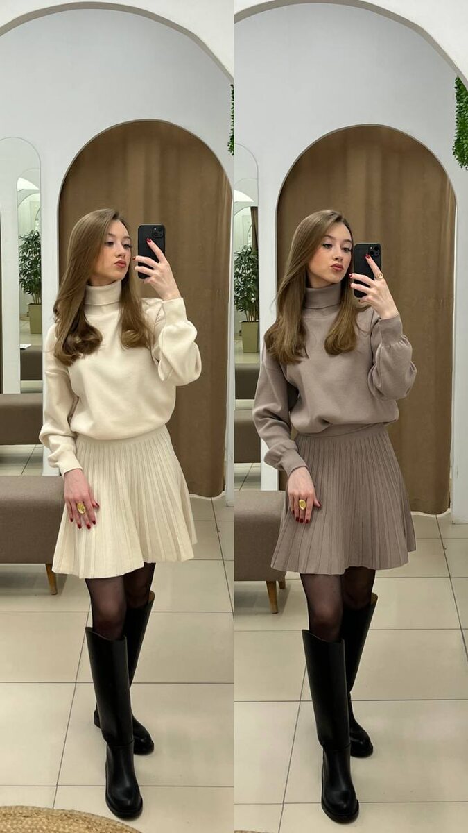 Плиссированные юбки – это всегда олицетворение легкости и женственности. В сочетании с объемными водолазками они создают идеальный баланс между уютом и элегантностью. Выбирайте оттенки от бежевого до глубокого графита – монохромные комплекты сейчас в топе модных трендов!
