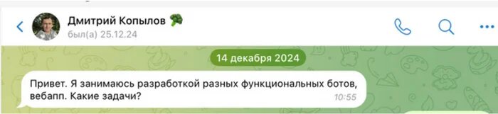 Один из заказов был особенно сложным — нужно было разработать бота для другой страны. Этот заказ нельзя было выполнить с помощью конструктора, требовалось всё разработать с нуля, включая административную часть на другом языке. Я начал искать разработчика, и в декабре ко мне обратился Дмитрий Копылов под ником @dm_copy.