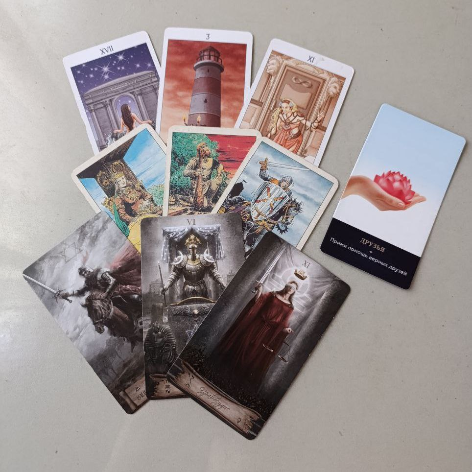 С картами из колоды "78 дверей" — Звезда, 3 жезлов и Сила — вы получите мощный заряд энергии и уверенности в своих силах. Колода "Зеркало судьбы" с Королевой пентаклей, 10 жезлов и Рыцарем мечей поможет вам разобраться в финансовых вопросах и научиться делегировать задачи, чтобы не перегружать себя. А расклад из колоды "Между небом и землей" с Рыцарем мечей, Колесницей и Правосудием подскажет, как двигаться вперед с решимостью и справедливостью.