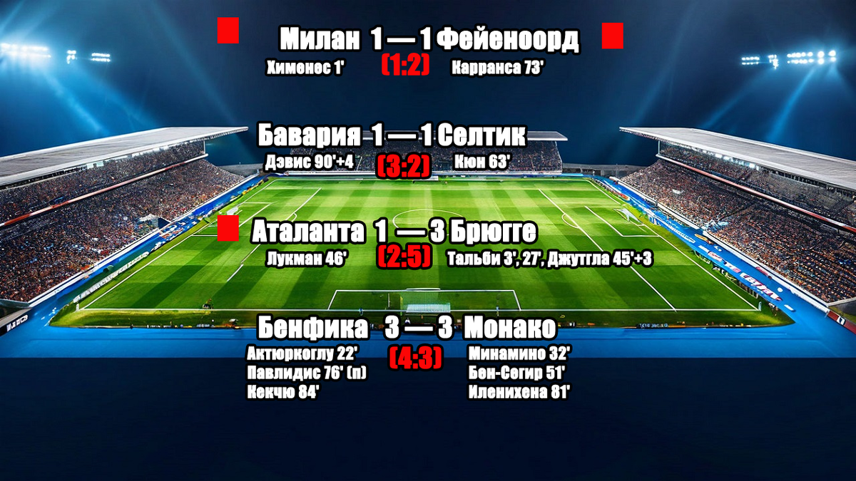Доброй ночи. Определились 4 участника 1/8 финала Лиги Чемпионов. Милан на 80-тысяной «Джузеппе Меацце» принял Фейеноорд. После первой игры россонери уступали 0:1. 14 травмированных было в лазарете у гостей. Обратите внимание: Хименес вывел итальянцев вперед на 1-й минуте. Карранса сравнял и вывел Фейеноорд в 1/8 финала. Общий счет – 2:1. Команда доигрывали 10 на 10. Эрнандес получил удаление на 51-й за симуляцию. Голландцы остались без игрока в конце на 90-й. Бавария на 75-тысячной «Альянс Арене» приняла Селтик. Вспомним, в Глазго немцы выиграли со счетом 2:1. На домашней арене мюнхенцы не сумели выиграть – 1:1. Тем не менее результат первой игры вывел их в 1/8 финала. Итоговый счет 3:2. Едва не произошла сенсация, если бы на 94-й Дэвис не сравнял счет в ответном матче. Игроком матча признан голкипер Селтика Шмейхель. Всё же сенсация произошла. Аталанта в первой игре переиграла Брюгге 2:1. В повторном матче бельгийцы после первого тайма громили соперника со счетом 3:0. Дубль оформил 19