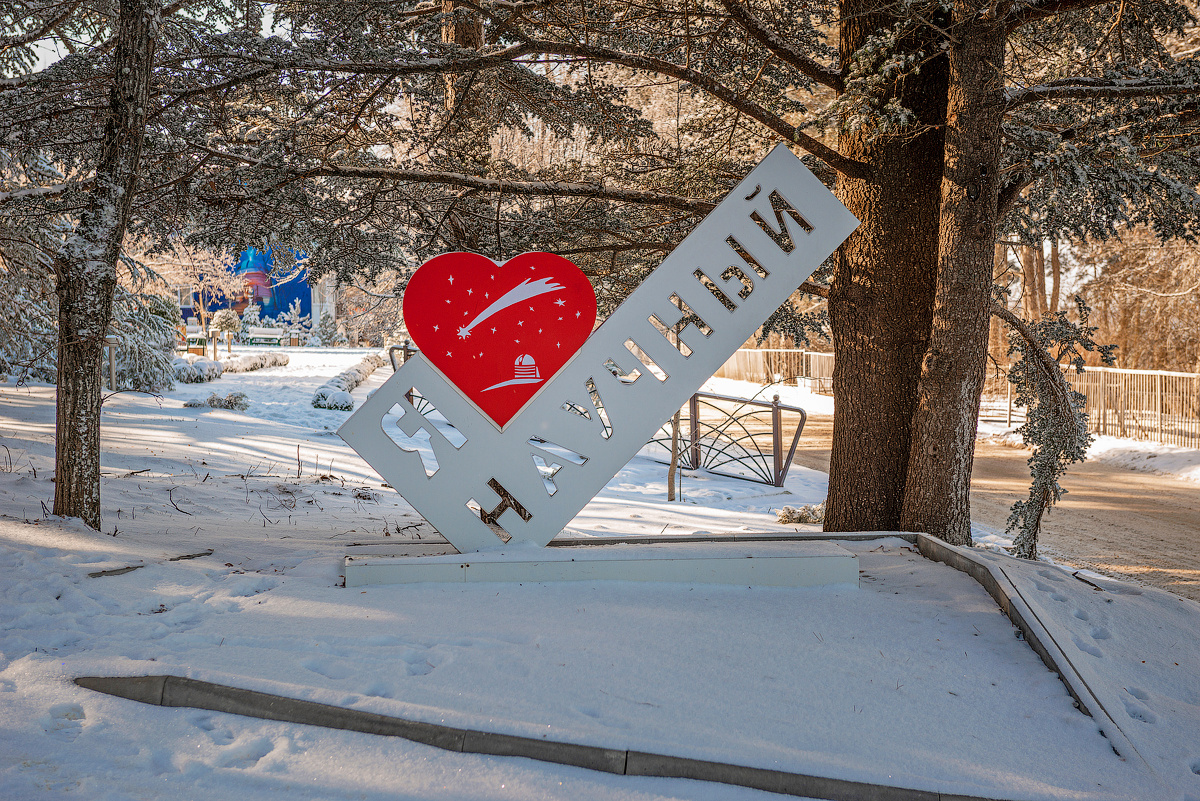 Друзья, сегодня прогуляемся по одному очень интересному местечку Крыма. Этот закрытый поселок городского типа редко включают в экскурсионные маршруты, и если вы в Крыму впервые, то навряд ли узнаете про его существование. И даже те, кто тут все-таки побывал, с удовольствием посмотрят на него зимой. Снег в Крыму - не частое явление, и мы очень избирательны в выборе мест, которые можно посетить в эти недолгие дни, когда он еще есть. Это место однозначно заслуживает посещения в этот период. Итак, поселок расположен на высоте 600 м над уровнем моря. В нем очень чистый воздух и часто бывает ясная погода – за эти особенности и облюбовали гору Сель-Бухра астрономы. Но это не курорт, а наоборот – на въезде устроен КПП, поселок имеет статус закрытого. Следует понимать специфику места – тут нацелены на исследования космоса, а не на туристическую сферу. Жители поселка занимаются удивительным делом – изучают звезды. Здесь около двух десятков телескопов. Летом они скрыты в густой листве редких поро