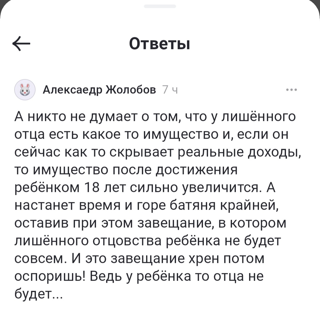 Этим наследством, как морковкой перед осликом, любят водить перед носом в качестве аргумента в семейных спорах. Чаще всего, чтобы удержать от "необдуманных действий" или заставить что-то сделать к выгоде "наследодателя". За примерами далеко ходить не надо. Слишком сильны у нас в народе легенды и мифы о наследственном праве, слишком сильна жажда халявы, на которую и пытаются ловить бывших членов семьи. "Лишая прав его отца, ты лишаешь ребёнка потенциального наследства этого самого отца". Как тебе такое? Смешались в кучу кони, люди... очереди наследования по завещанию и по закону. Обо всём этом стоит подумать матери, если она не хочет, чтобы ребёнок остался без наследства. Что мешает отцу просто не включить в завещание сына, даже "действующего" - да ничего не мешает. Если сын взрослый и дееспособный и не указан в завещании, он может в своей первой очереди наследования маршировать в сторону леса. Что мешает отцу вместо накопления наследства радостно его профукать и раздарить перед ух