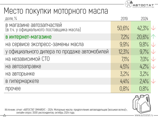 В конце 2024 года аналитическое агентство Автостат подготовило статистику о предпочтениях россиян при выборе и использовании моторных масел. Мы изучили данные и готовы поделиться с вами основными выводами. Что мы видим? Интернет-магазины ожидаемо выросли, причём почти втрое, и они перетянули на себя аудиторию специализированных магазинов. Но оффлайн всё равно лидирует. К сожалению, для интернета нет деления на «маркетплейсы» и «остальные сайты», но рискнём предположить, что маркетплейсы за счёт огромного выбора, бесплатной доставки и демпинга захватывают основную долю рынка. Большинство людей меняет масло по пробегу, причём свыше 40% делают это раз в 7,5 тыс км или даже раньше. И мы не устаём говорить, что это правильно! Нет, «масляные дельцы» не придумывают несуществующие проблемы – из-за наших климатических и дорожных реалий, российские автомобили находятся в сложных условиях эксплуатации. А потому в технической книжке машины наверняка найдётся сноска о том, что менять масло нужно ка