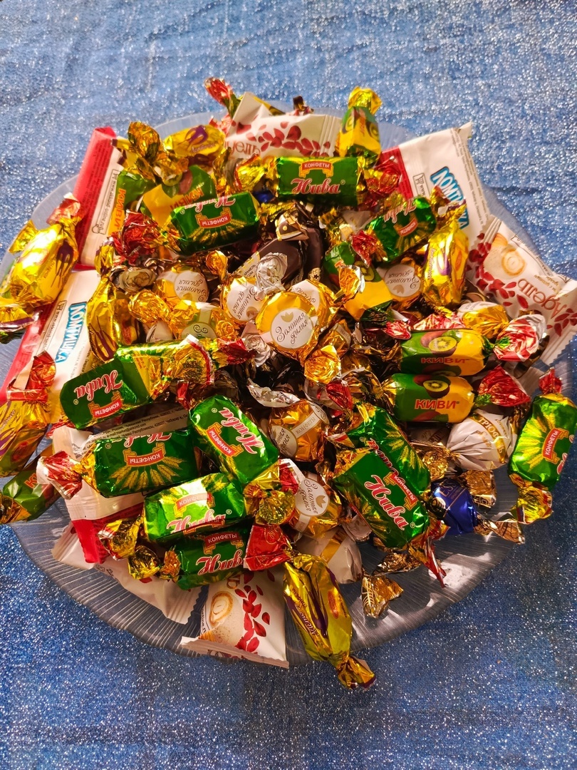 -Ого, да тут целая куча шоколадных конфет и всяких вкусностей. Вон и шоколадки и даже вафельный тортик положили.