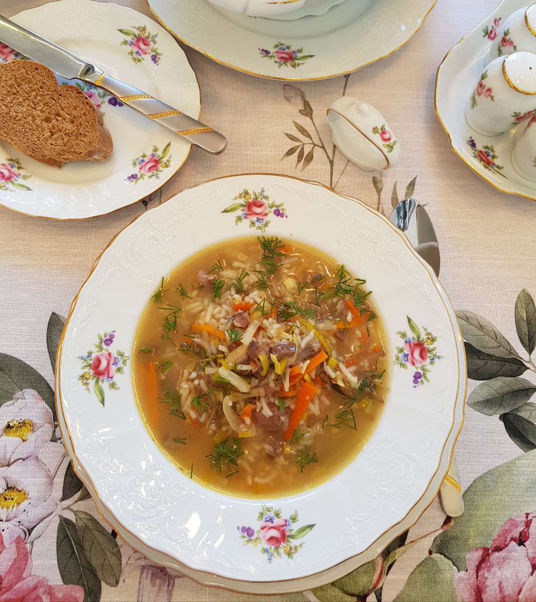 Добрый день, дорогие друзья! В сегодняшнем рецепте я предлагаю частично вернуться к первоначальному рецепту, который был популярным трактирным блюдом в царской России. Для приготовления нам понадобятся: 800 грамм отварной говядины, 1,5 литра говяжьего бульона, 200 грамм риса басмати, 1 морковь, 1 головка репчатого лука, 1 лук-порей, 300 грамм корня сельдерея, 3 томата, 6 соленых огурцов, 1/2 чайной ложки черного молотого перца, 2 столовые ложки подсолнечного масла, 2 стакана огуречного рассола, при необходимости соль. Для приготовления говяжьего бульона нам понадобятся: 2 килограмма говядины на кости, 1/2 столовой ложки соли, 1/2 чайной ложки черного перца горошком, 3 лавровых листа, 1 столовая ложка подсолнечного масла, зелень укропа и петрушки. Приготовление: мясо смазать растительным маслом, выложить на противень, застеленный пергаментной бумагой. Запекать в духовом шкафу на режиме гриль при температуре 200 градусов Цельсия в течение 30 минут, в середине времени перевернуть куски м