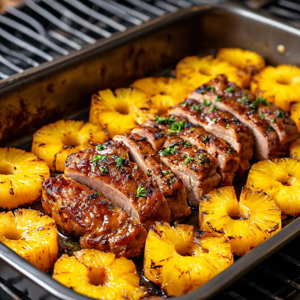 Ингредиенты: 600 г свинины (шея или карбонат) 🥩 1 банка консервированных ананасов (колечки) 🍍 200 г твердого сыра (например, гауда или чеддер) 🧀 2-3 зубчика чеснока 🧄 2 ст. ложки соевого соуса 1 ч. ложка меда (по желанию) Соль и черный перец по вкусу 1 ч. ложка паприки Растительное масло для смазывания формы Приготовление: Подготовка мяса:Свинину нарежьте на куски толщиной около 1,5 см. Отбейте их с обеих сторон, посолите, поперчите и натрите паприкой.