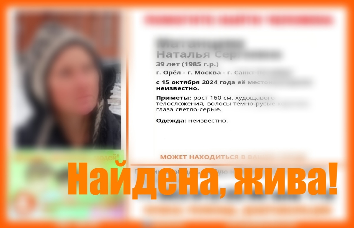 Пропала #Матанцева Наталья Сергеевна, 39 лет, г. #Орёл - г. #Москва - г. #Санкт-Петербург С 15 октября 2024 года её местонахождение неизвестно Если у вас есть сведения, которые могут посодействовать поиску, писать. СЮДА ️ #берегите_себя_и_своих_близких_поисково_спасательный_отряд_artur Наши социальные сети и другие проекты отряда. Наш сайт Одноклассники Социальная сеть В Контакте Наш Telegram -----------‐--------------------------------‐-------‐‐'-‐--------------------— Поддержать наш проект и ознакомиться с юридическими документами можно на нашем сайте