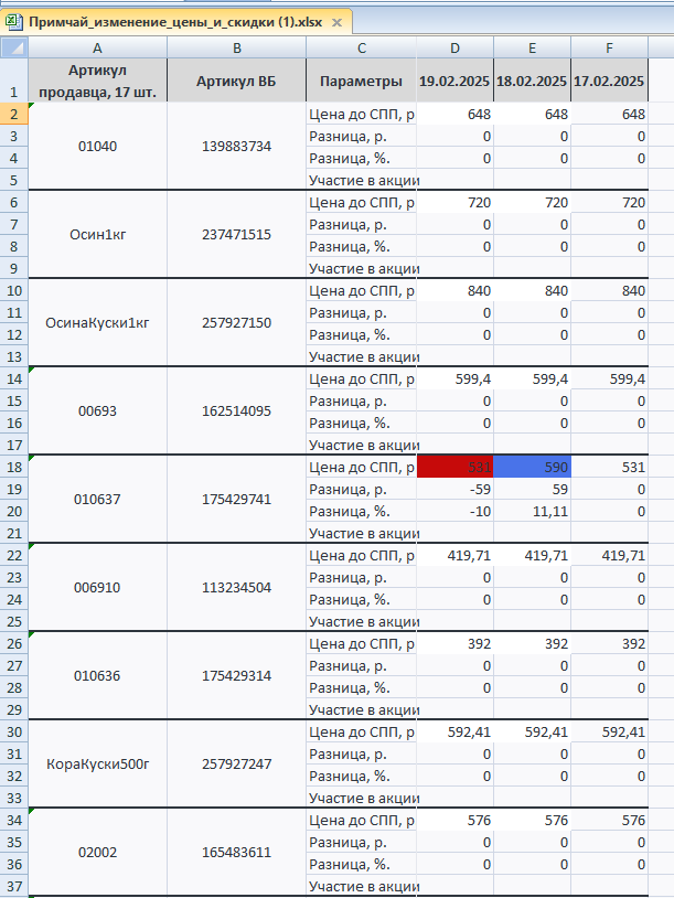 Делимся новостями: создали и успешно протестировали "ядро" для собственного сервиса аналитики. Пока только на Wildberries Сейчас сделали автовыгрузку данных по: 1) Ценам, где произошедшие изменения выделяются цветом. Площадка добавила Ваши товары в акции, а Вы боитесь это упустить? Заходите в такой отчёт и ищите красный цвет. Где его видите - произошло снижение цены со вчера. Где синий цвет - произошёл подъём цен. Цвета и интефейс будем совершенствовать. 2) Рекламе: автосоставление и выгрузка данных по рекламным кампаниям. Тоже таблица пока простенькая, но всё же, собирает так необходимые нам данные. Сейчас мы вручную собираем эти данные (а также другие из иных разделов), сводим в одну, откуда получаем необходимую инфомацию для принятия решений: понижать расход/повышать, какие из рекламных кампаний нуждаются в изменениях и т.д. Планируем всё это выгрузить в онлайн, чтобы у каждого поставщика был доступ к этим данным.