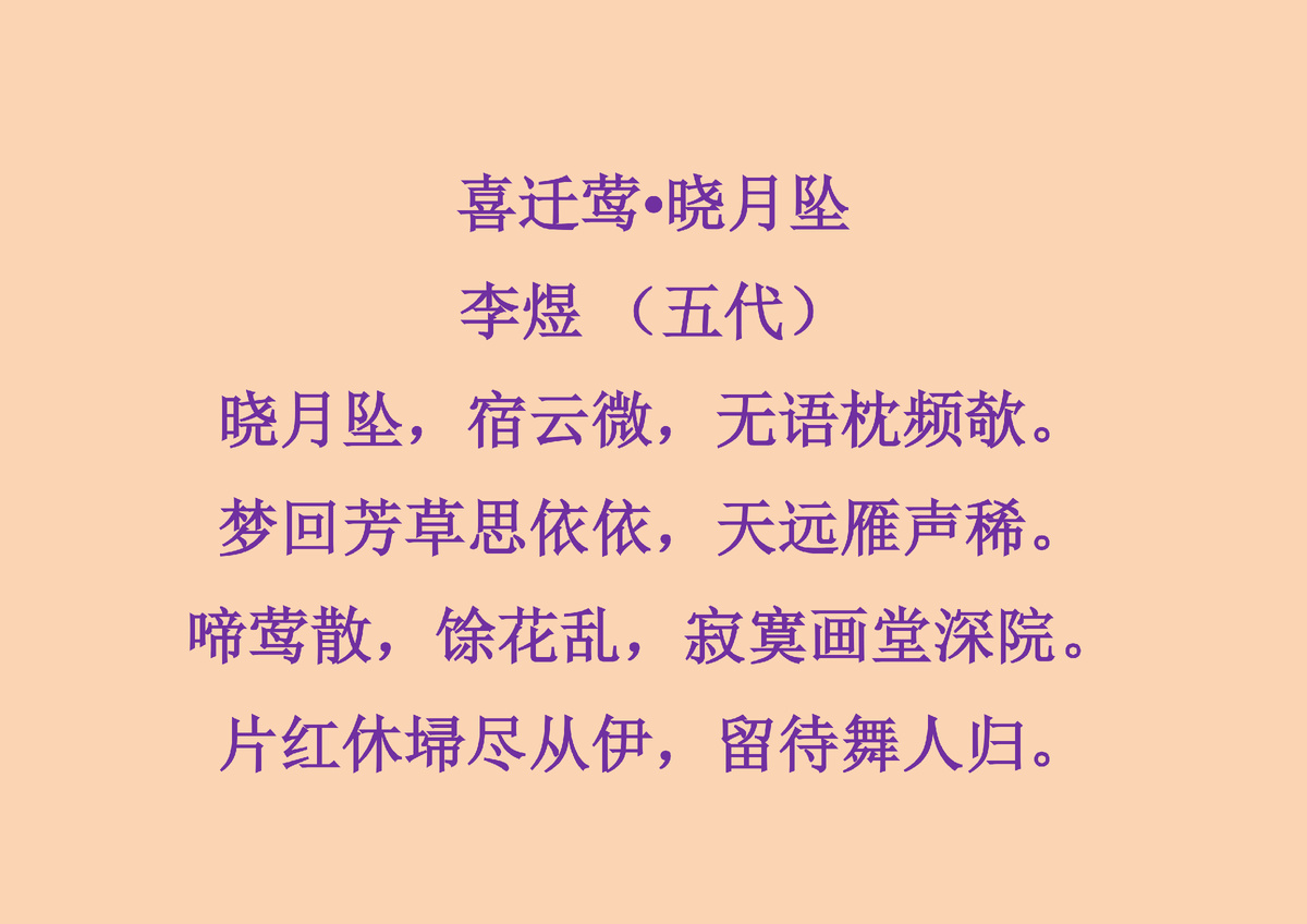 Стихотворение 1. 喜迁莺•晓月坠 Послушайте несколько раз стихотворение: Обратите внимание: стихотворение предоставлено вам в форме картинки. Это сделано с той целью, чтобы вы осуществляли поиск слов в словаре с помощью приложения Trainchinese через функцию «Ручной ввод» (手写). Так вы сможете потренироваться в поиске иероглифов. Как установить Trainchinese – смотри в рекомендациях: Задание: Найдите в словаре значения каждого слова в стихотворении. Выпишите значения слов и иероглифов (каждой морфемы), которые соответствуют тексту стихотворения. Перепишите стихотворение два раза, многократно прослушивая его чтение. Укажите транскрипцию под каждым иероглифом. Попробуйте сделать дословный и художественный перевод стихотворения.