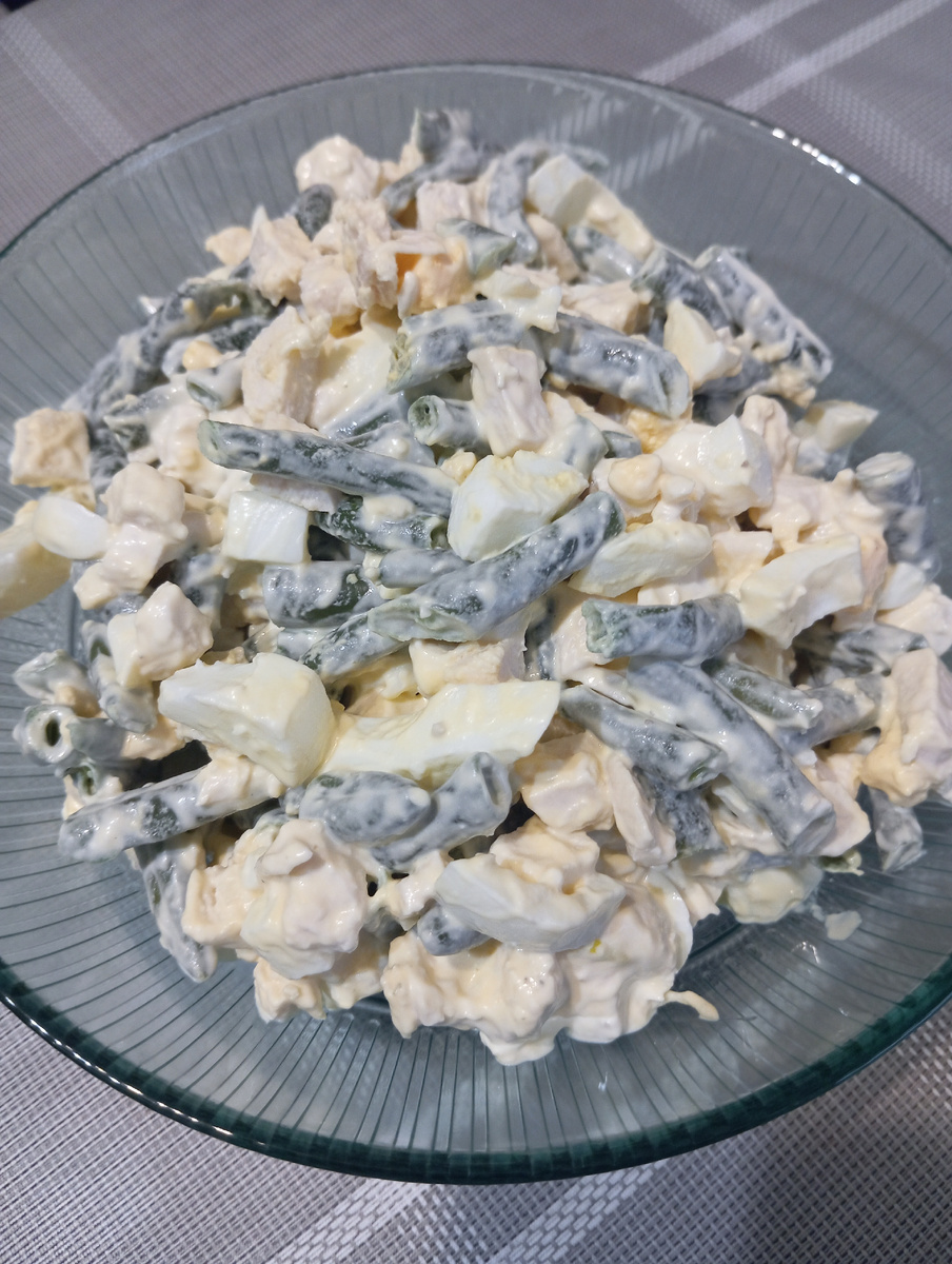 Именно поэтому я решила сдобрить его майонезом. Здравствуйте! Я стручковую фасоль распробовала только будучи взрослой, как и многие другие продукты. Сына съесть такую траву не заставишь, а я вот люблю. Поэтому подобные эксперименты провожу в его отсутствии) Итак, это белковая бомба, как любят называть подобные блюда блогеры. По моим прикидкам, в ста граммах салата больше 12 граммов белка при минимальном количестве жиров. Если заправить салат нежирной сметаной, смешанной с горчицей, получится еще полезнее. Но мы пошли другим путем. Итак, для приготовления взяла: Отварила курицу, нарезала кубиком. Вареный яйца измельчила через решетку. Фасоль отварила несколько минут в кипящей подсоленной воде. Все смешала, добавила измельченный зубчик чеснока и заправила майонезом. Это мой выбор, мне хотелось именно с майонезом, но и со сметаной будет не хуже. Кто-то в такой салат добавляет еще консервированную кукурузу, но мне ее не хочется. Можно еще зелени свежей насыпать. В результате отличный ужин