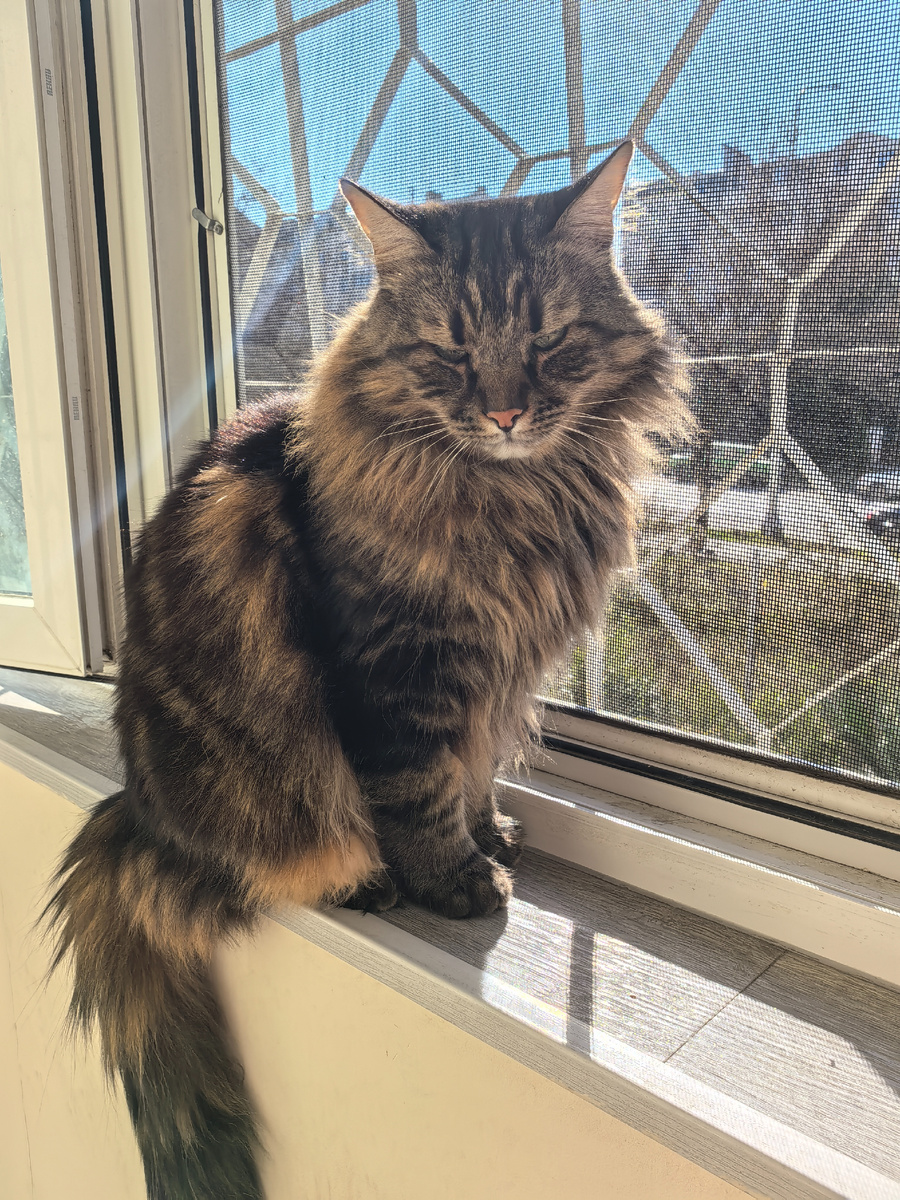 Всем привет! С вами Кузя Кусалочкин и сегодня я расскажу про свой довольно спокойный и вкусный день. Утром пришёл мурчать хозяйке. Ей нравится когда я прихожу, рядышком ложусь и мурчу, но только без кусей. А как так без кусей? Я же Кусалочкин! Намурчал на паштет. Но опять дали только треть пачки. А ещё хозяйка сказала, что я воняю пылью. Ну лажу же под ванной, а там никто не убирает (заделано плиткой много лет назад и есть маленький люк). Кстати, чупакабра больше не шкодила, мы с ней договорились. Днём посидел на балконе. Вы можете подумать, что у нас солнечно, тепло и хорошо: Вот только солнышко у нас светит, но не греет. А утром и вечером очень холодно. Посидел на балконе и решил, что пора спать. А тут хозяин халат свой бросил на кровати, было приятно на нём спать: Пока я спал, хозяйка сложила вещи постиранные и помыла пол. Да, она его уже мыла позавчера, но что-то он быстро запачкался. Я наполнитель разнёс, а кто-то его растоптал. Когда проснулся, то мне стало скучно, я по