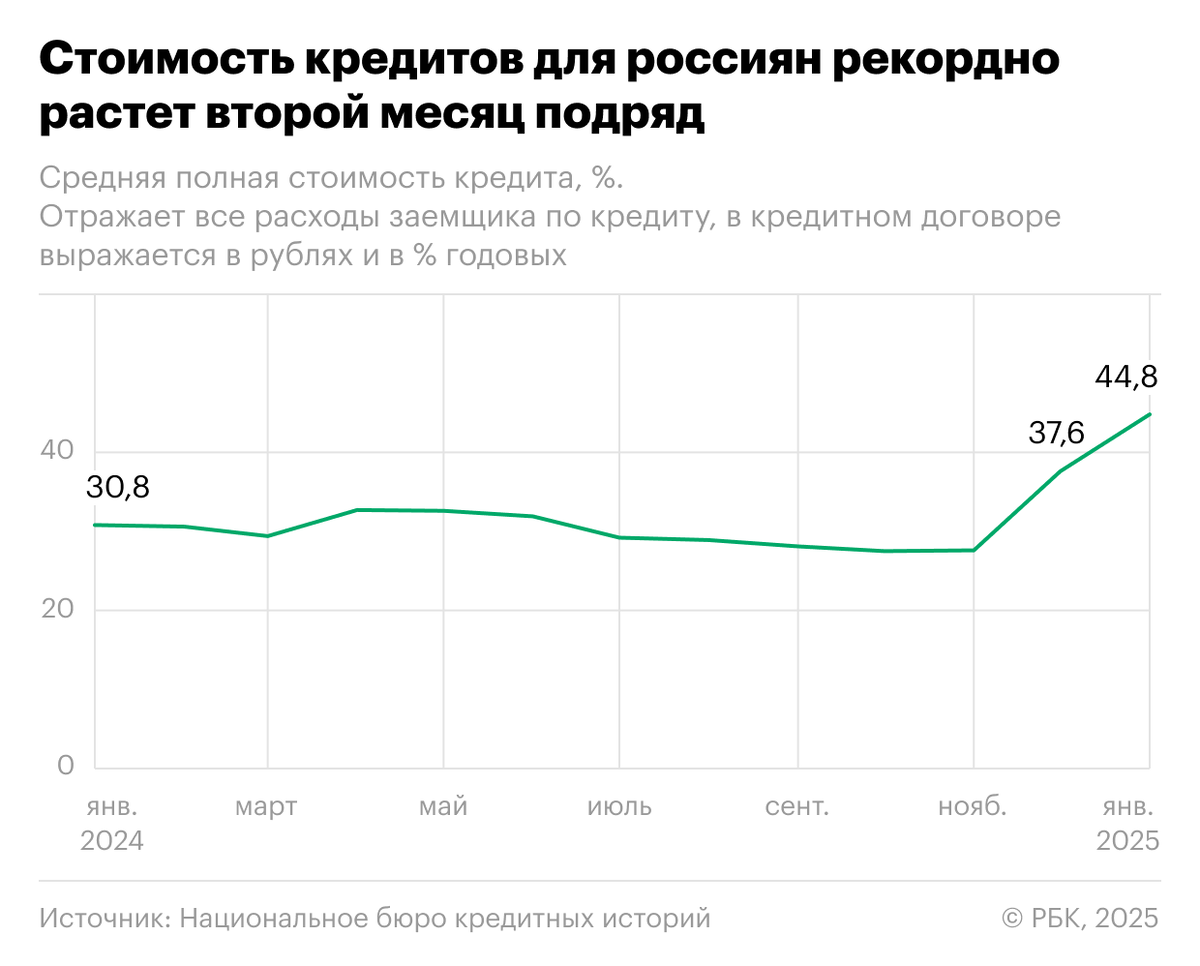 В январе 2025 года средняя величина полной стоимости кредита (ПСК) в сегменте кредитных карт достигла нового рекорда — 44,8%, следует из данных Национального бюро кредитных историй (НБКИ), которые изучил РБК. За месяц показатель увеличился на 7,2 процентного пункта (п.п.), а до этого в декабре прирост ПСК составил 10 п.п. Таким образом, с ноября средняя стоимость заимствований по кредиткам в России поднялась более чем в полтора раза (тогда она составляла 27,6%).