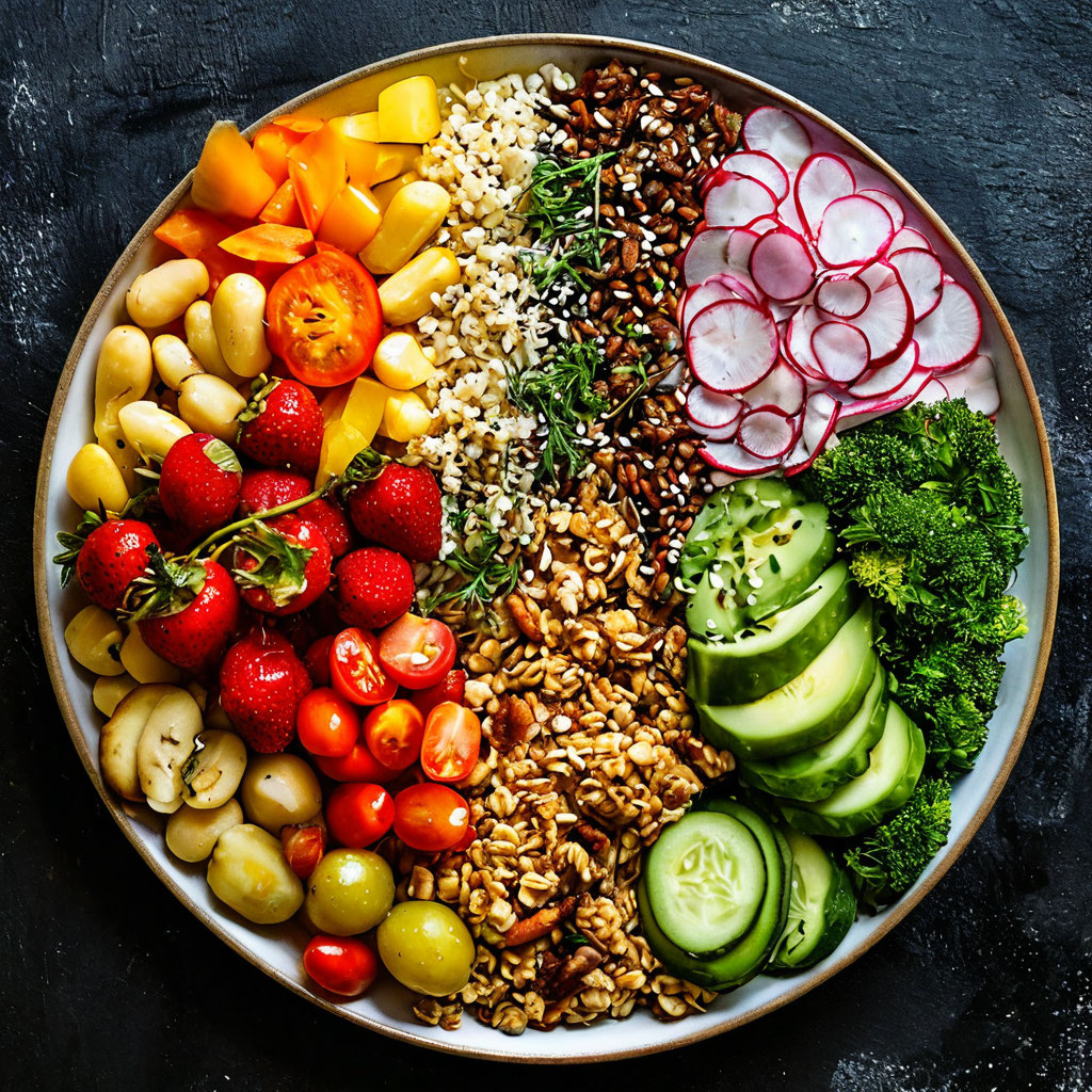 - Разнообразие продуктов: Важно включать в рацион различные группы продуктов, такие как фрукты, овощи, цельнозерновые продукты, белки (мясо, рыба, бобовые), молочные продукты и полезные жиры.