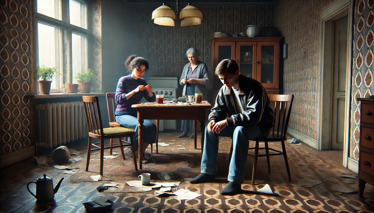 Стас нахмурился, просматривая завещание. Он выглядел так, будто вот-вот швырнёт бумаги в стену. Рядом на старом обеденном столе стояла пустая чашка, которую Марина не успела убрать. В квартире стояла тяжёлая тишина — мама специально закрылась на кухне, чтобы не вмешиваться в ссору, но явно всё слышала.