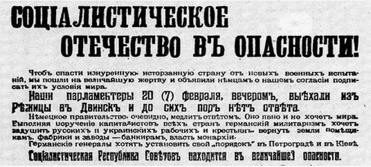 "Чтоб спасти изнурённую, истерзанную страну от новых военных испытаний, мы пошли на величайшую жертву и объявили немцам о нашем согласии подписать их условия мира. Наши парламентёры 20 (7) февраля вечером выехали из Режицы в Двинск, и до cих пор нет ответа. Немецкое правительство, очевидно, медлит с ответом. Оно явно не хочет мира. Выполняя поручение капиталистов всех стран, германский милитаризм хочет задушить русских и украинских рабочих и крестьян, вернуть земли помещикам, фабрики и заводы - банкирам, власть - монархии. Германские генералы хотят установить свой «порядок» в Петрограде и в Киеве. Социалистическая республика Советов находится в величайшей опасности. До того момента, как поднимется и победит пролетариат Германии, священным долгом рабочих и крестьян России является беззаветная защита республики Советов против полчищ буржуазно-империалистской Германии. Совет Народных Комиссаров постановляет: