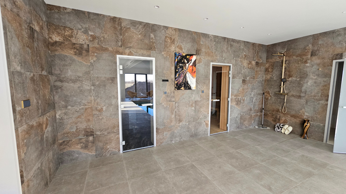 Рады представить вашему вниманию ещё один наш объект — частный банный комплекс. В этом уникальном сооружении мы уделили особое внимание строительству помещений для сауны и хамама. Сегодня мы с удовольствием покажем вам, как выглядят эти комнаты. Стены хамама отделаны мраморной мозаикой. Сиденья, массажный стол и пол в этом помещении сделаны из крупноформатного мрамора тёмного цвета с ярко выраженными прожилками. Глянцевая поверхность мрамора придаёт помещению глубину и изысканность. Потолок имеет форму конверта и украшен темной керамической мозаикой с золотистыми вставками, которые создают иллюзию звезд. Курна для омовения, как и потолок, украшена керамической мозаикой. Это создает ощущение единства в интерьере помещения. Курна имеет цилиндрическую форму и была изготовлена на объекте нашими специалистами. Подсветка в хамам выполнена из светодиодной лентов теплого белого света, Справа от входа, возле стены, находится короб с подсветкой и четырьмя паровыми форсунками. Пар, медленно выхо