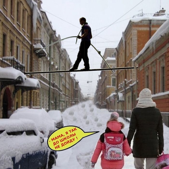 Первые работы автор развесил во дворе на улице Восстания. Две из них посвящены недостаточной уборке снега на дорогах и тротуарах.